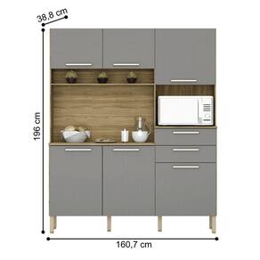 A Cozinha é produzida com madeira reconstituída - MDP de 12 mm e MDP de 15 mm nos tampos, provindo de reservas florestais para este fim, respeitando o meio ambiente. Possui seis portas, duas amplas gavetas - nas portas e gavetas são utilizados dobradiças e corrediças 100% metálicas. Os puxadores são em plástico resistente (poliestireno) com acabamento metalizado, que proporciona grande durabilidade. Seis pés reguláveis em plástico resistente (polipropileno) garantem a estabilidade do produto, podendo-se fazer pequenes ajustes na montagem, para o produto se adequar mesmo em pisos com pequenas irregularidades. Conta com nicho para pequenos objetos, além disso, tem nicho para micro-ondas e passa-fio no traseiro facilitando o acesso à tomada na parede. O espaço interno é bem dividido com a utilização de prateleiras, para melhor organizar os utensílios da cozinha. O acabamento é com pintura UV, deixando o móvel mais bonito com padrões de cor que trazem modernidade e beleza a sua cozinha.