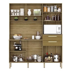 A Cozinha é produzida com madeira reconstituída - MDP de 12 mm e MDP de 15 mm nos tampos, provindo de reservas florestais para este fim, respeitando o meio ambiente. Possui seis portas, duas amplas gavetas - nas portas e gavetas são utilizados dobradiças e corrediças 100% metálicas. Os puxadores são em plástico resistente (poliestireno) com acabamento metalizado, que proporciona grande durabilidade. Seis pés reguláveis em plástico resistente (polipropileno) garantem a estabilidade do produto, podendo-se fazer pequenes ajustes na montagem, para o produto se adequar mesmo em pisos com pequenas irregularidades. Conta com nicho para pequenos objetos, além disso, tem nicho para micro-ondas e passa-fio no traseiro facilitando o acesso à tomada na parede. O espaço interno é bem dividido com a utilização de prateleiras, para melhor organizar os utensílios da cozinha. O acabamento é com pintura UV, deixando o móvel mais bonito com padrões de cor que trazem modernidade e beleza a sua cozinha.