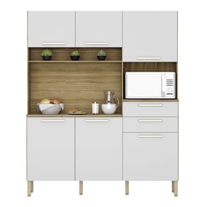 A Cozinha é produzida com madeira reconstituída - MDP de 12 mm e MDP de 15 mm nos tampos, provindo de reservas florestais para este fim, respeitando o meio ambiente. Possui seis portas, duas amplas gavetas - nas portas e gavetas são utilizados dobradiças e corrediças 100% metálicas. Os puxadores são em plástico resistente (poliestireno) com acabamento metalizado, que proporciona grande durabilidade. Seis pés reguláveis em plástico resistente (polipropileno) garantem a estabilidade do produto, podendo-se fazer pequenes ajustes na montagem, para o produto se adequar mesmo em pisos com pequenas irregularidades. Conta com nicho para pequenos objetos, além disso, tem nicho para micro-ondas e passa-fio no traseiro facilitando o acesso à tomada na parede. O espaço interno é bem dividido com a utilização de prateleiras, para melhor organizar os utensílios da cozinha. O acabamento é com pintura UV, deixando o móvel mais bonito com padrões de cor que trazem modernidade e beleza a sua cozinha.