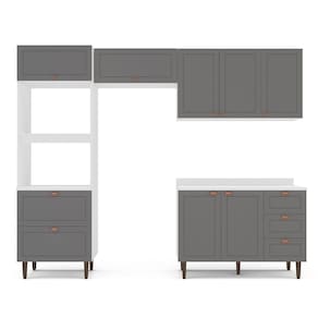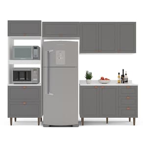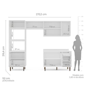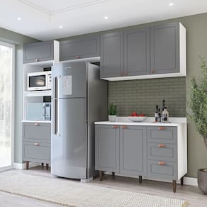 A Cozinha Pérola Completa possui 4 peças com altura de 219,4 cm largura de 270,2 cm e profundidade de balcão de 52 cm. Com portas e gavetas em MDF usinadas em baixo relevo, possui estilo Americano e design contemporâneo, funcional e prático para seu dia a dia. Seus puxadores dos módulos inferior são no formato de concha. E na parte superior são modelo pontual, ambos na cor cobre. Possui dobradiças 3,5cm Slide On (sistema de amortecimento anti batida) e na porta basculante possui além das dobradiças Slide On pistão para proporcionar uma maior abertura. Possui tampo de 2,5cm no balcão. Acabamento da Prateleira: Pintura Escala de Brilho da Prateleira: Fosco Acabamento da Gaveta: Pintura Escala de Brilho da Gaveta: Fosco Material do Puxador da Gaveta: Plástico Acabamento da Porta: Pintura Escala de Brilho da Porta: Fosco Material do Puxador da Porta: Plástico Acabamento dos Pés: Poliéster Acompanha Rodapé Decorativo: Não Acompanha Tampo: Não Altura dos Pés: 17 cm Altura Máxima dos Pés: 17.0000 Ambiente Principal: Cozinha Balcão Suporta Pia: Sim codigo_ean: 7909903976494 Complexidade da Montagem: Média: pode ser montado por mais de uma pessoa e/ou necessite de maior conhecimento para montagem Cor: Branco/Cinza Cor do Produto: Branco/Cinza Cor Flex: Não Cor Interna: Branco Escala de Brilho: Fosco Espessura do Material da Estrutura: 15 mm Gaveta com Chave: Não Itens Inclusos: 1 móvel desmontado, kit de ferragens, termo de garantia e manual de montagem. Linha ou Coleção: Pérola Manual de Montagem e Instalação: https://product-hub-prd.madeiramadeira.com.br/961207/documents/f66ed996-e4e4-45f7-a7c0-f39b80ae937182302316493317254577324703.pdf Marca: Yescasa Material da Dobradiça/Corrediça da Porta: Metálica Material da Gaveta: MDF Material da Porta: MDF Material da Prateleira: MDP Material do Fundo: HDP Material dos Pés: Plástico Medida de cada item (A x L x P): Torre Quente: 219,4 x 70,2 x 52 Balcão: 84 x 120 x 50,5 Aéreo: 67 x 120 x 36,5 Basculante: 33,5 x 80 x 36,5 Montagem Flex: Não Necessita Montagem: Sim O Balcão Acompanha Pia: Não Origem do Produto: Nacional Pés Reguláveis: Sim Peso: 125,2 kg Peso Máximo por Gaveta: 5 kg Peso Máximo por Prateleira: 10 kg Possui Pés: 10 Possui Portas: Sim Possui Prateleiras: Sim Possui recorte para Cooktop: Não Possui Rodízio: Não Possui Vidro: Não Produto Montado: Sim Recomendações de Uso, Manutenção e Limpeza: Utilize um pano macio umedecido com água e sabão neutro, seguido de pano seco. Não utilize produtos químicos ou abrasivos para limpeza, pois estes danificam o revestimento do móvel. Sapatas Niveladoras: Sim Sistema de Montagem: Cavilha, parafuso, minifix e prego Suporta Até (kg): 10 kg Tamanho Indicado da Pia: L: 120 x P: 52 cm Tamanho Indicado do Tampo: L: 120 x P: 52 cm Tipo de Corrediça da Gaveta: Metálica Telescópica Tipo de Dobradiça da Porta: Soft close Tipo de Puxador da Gaveta: Externo Tipo de Puxador da Porta: Externo