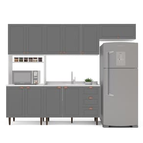 A Cozinha Pérola Completa possui 4 peças com altura de 219,4 cm largura de 280 cm e profundidade de balcão de 52 cm. Com portas e gavetas em MDF usinadas em baixo relevo, possui estilo Americano e design contemporâneo, funcional e prático para seu dia a dia. Seus puxadores dos módulos inferior são no formato de concha. E na parte superior são modelo pontual, ambos na cor cobre. Possui dobradiças 3,5cm Slide On (sistema de amortecimento anti batida) e na porta basculante possui além das dobradiças Slide On pistão para proporcionar uma maior abertura.