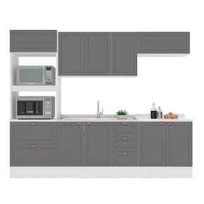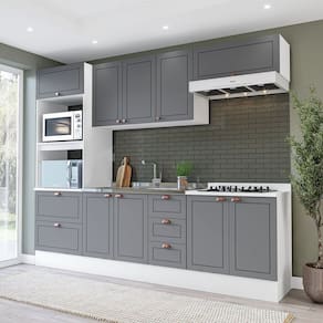 A Cozinha Pérola Completa possui 5 peças com altura de 219,4 cm largura de 270,2 cm e profundidade de balcão de 52 cm. Com portas e gavetas em MDF usinadas em baixo relevo, possui estilo Americano e design contemporâneo, funcional e prático para seu dia a dia. Seus puxadores dos módulos inferior são no formato de concha. E na parte superior são modelo pontual, ambos na cor cobre. Possui dobradiças 35mm Slide On (sistema de amortecimento anti batida) e na porta basculante possui além das dobradiças Slide On pistão para proporcionar uma maior abertura. Acompanha rodapé para fechamento.