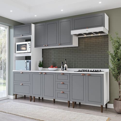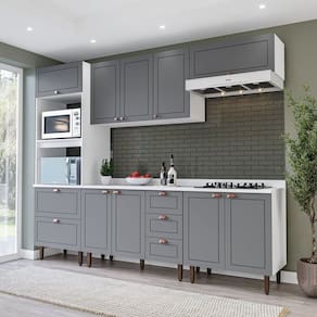 A Cozinha Pérola Completa possui 5 peças com altura de 219,4 cm largura de 270,2 cm e profundidade de balcão de 52 cm. Com portas e gavetas em MDF usinadas em baixo relevo, possui estilo Americano e design contemporâneo, funcional e prático para seu dia a dia. Seus puxadores dos módulos inferior são no formato de concha. E na parte superior são modelo pontual, ambos na cor cobre. Possui dobradiças 35mm Slide On (sistema de amortecimento anti batida) e na porta basculante possui além das dobradiças Slide On pistão para proporcionar uma maior abertura. Acompanha Tampo no balcão de 120 cm. A cozinha é composta de Torre quente, aéreo 3 portas, balcão 2 portas 3 gavetas, basculante e balcão 2 portas.