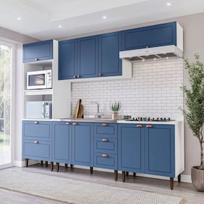 A Cozinha Pérola Completa possui 5 peças com altura de 219,4 cm largura de 270,2 cm e profundidade de balcão de 52 cm. Com portas e gavetas em MDF usinadas em baixo relevo, possui estilo Americano e design contemporâneo, funcional e prático para seu dia a dia. Seus puxadores dos módulos inferior são no formato de concha. E na parte superior são modelo pontual, ambos na cor cobre. Possui dobradiças 35mm Slide On (sistema de amortecimento anti batida) e na porta basculante possui além das dobradiças Slide On pistão para proporcionar uma maior abertura. A cozinha é composta de Torre quente, aéreo 3 portas, balcão 2 portas 3 gavetas, basculante e balcão 2 portas.