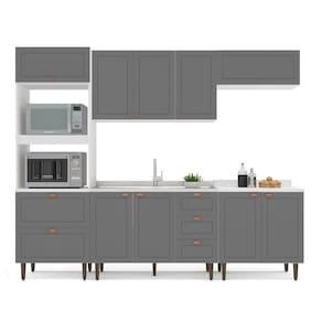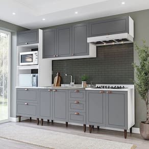 A Cozinha Pérola Completa possui 5 peças com altura de 219,4 cm largura de 270,2 cm e profundidade de balcão de 52 cm. Com portas e gavetas em MDF usinadas em baixo relevo, possui estilo Americano e design contemporâneo, funcional e prático para seu dia a dia. Seus puxadores dos módulos inferior são no formato de concha. E na parte superior são modelo pontual, ambos na cor cobre. Possui dobradiças 35mm Slide On (sistema de amortecimento anti batida) e na porta basculante possui além das dobradiças Slide On pistão para proporcionar uma maior abertura. A cozinha é composta de Torre quente, aéreo 3 portas, balcão 2 portas 3 gavetas, basculante e balcão 2 portas.