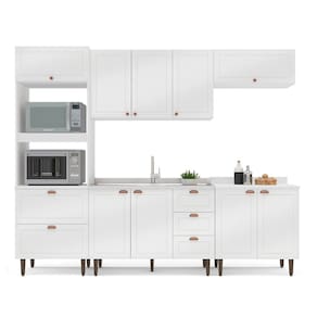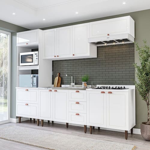 A Cozinha Pérola Completa possui 5 peças com altura de 219,4 cm largura de 270,2 cm e profundidade de balcão de 52 cm. Com portas e gavetas em MDF usinadas em baixo relevo, possui estilo Americano e design contemporâneo, funcional e prático para seu dia a dia. Seus puxadores dos módulos inferior são no formato de concha. E na parte superior são modelo pontual, ambos na cor cobre. Possui dobradiças 35mm Slide On (sistema de amortecimento anti batida) e na porta basculante possui além das dobradiças Slide On pistão para proporcionar uma maior abertura. A cozinha é composta de Torre quente, aéreo 3 portas, balcão 2 portas 3 gavetas, basculante e balcão 2 portas.