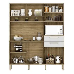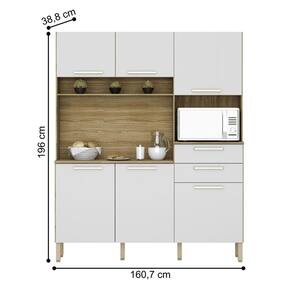 A Cozinha é produzida com madeira reconstituída - MDP de 12 mm e MDP de 15 mm nos tampos, provindo de reservas florestais para este fim, respeitando o meio ambiente. Possui seis portas, duas amplas gavetas - nas portas e gavetas são utilizados dobradiças e corrediças 100% metálicas. Os puxadores são em plástico resistente (poliestireno) com acabamento metalizado, que proporciona grande durabilidade. Seis pés reguláveis em plástico resistente (polipropileno) garantem a estabilidade do produto, podendo-se fazer pequenes ajustes na montagem, para o produto se adequar mesmo em pisos com pequenas irregularidades. Conta com nicho para pequenos objetos, além disso, tem nicho para micro-ondas e passa-fio no traseiro facilitando o acesso à tomada na parede. O espaço interno é bem dividido com a utilização de prateleiras, para melhor organizar os utensílios da cozinha. O acabamento é com pintura UV, deixando o móvel mais bonito com padrões de cor que trazem modernidade e beleza a sua cozinha.