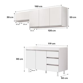 Cada peça é construída em 100% MDF e possui um acabamento em BP que garante durabilidade e resistência. Este conjunto inclui um impressionante Balcão Gabinete de 120cm, completo com 03 gavetas equipadas com corrediças telescópicas para um deslize suave e silencioso. Além disso, o armário da geladeira possui pistão a gás, proporcionando abertura e fechamento suaves e sem esforço.