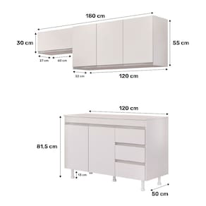 Cada peça é construída em 100% MDF e possui um acabamento em BP que garante durabilidade e resistência. Este conjunto inclui um impressionante Balcão Gabinete de 120cm, completo com 03 gavetas equipadas com corrediças telescópicas para um deslize suave e silencioso. Além disso, o armário da geladeira possui pistão a gás, proporcionando abertura e fechamento suaves e sem esforço.