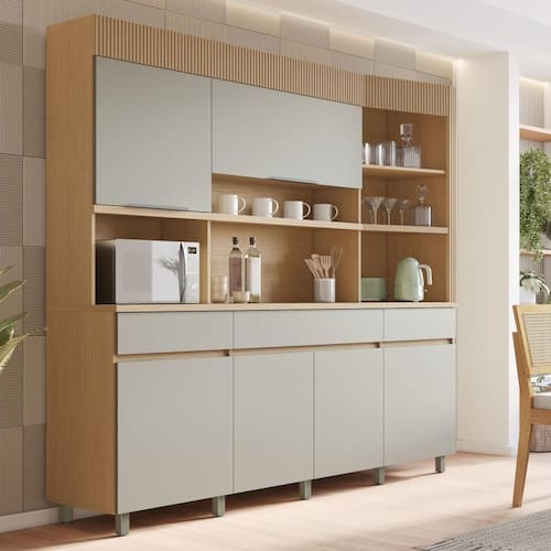 Ideal para ambientes pequenos, a Cozinha Realeza combina design moderno com funcionalidade. Conta com 6 portas, 3 gavetas e ótimo aproveitamento interno. Estrutura 100% MDF, acabamento semi-brilho e pés reguláveis. Estilo e praticidade em um só móvel!