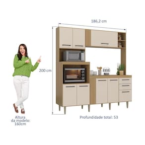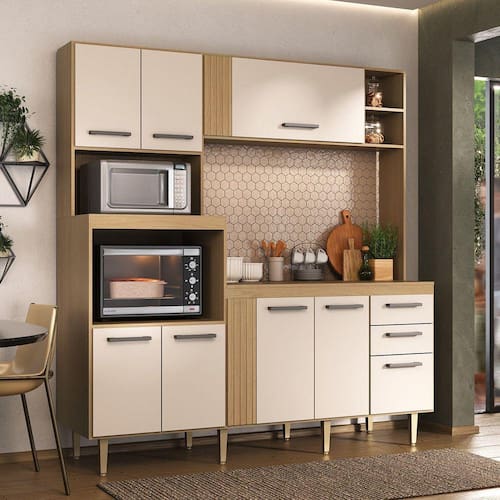 Cozinha ripada compacta Grazi na cor freijó/areia, detalhe em ripado MDF no aéreo e balcão, com oito portas e duas gavetas, Possui quatro prateleiras, oito pés, dobradiças caneco 26mm e corrediças metálicas. Ideal para complementar o ambiente da cozinha. Acabamento da Prateleira: Pintura UV Escala de Brilho da Prateleira: Semi-Brilho Acabamento da Gaveta: Pintura UV Escala de Brilho da Gaveta: Semi-Brilho Material do Puxador da Gaveta: Plástico Acabamento da Porta: Pintura UV Escala de Brilho da Porta: Semi-Brilho Material do Puxador da Porta: Plástico Acabamento dos Pés: Polipropileno Acompanha Tampo: Sim Altura dos Pés: 17 cm Ambiente Principal: Cozinha codigo_ean: 7909903344477 Complexidade da Montagem: Média: pode ser montado por mais de uma pessoa e/ou necessite de maior conhecimento para montagem Cor: Freijó/Areia Cor do Produto: Freijó/Areia Cor Interna: Freijó Escala de Brilho: Semi-Brilho Espessura do Material da Estrutura: 12 mm Espessura do Tampo: 15 mm Gaveta com Chave: Não Itens Inclusos: 1 Cozinha Compacta, Kit Ferragens e Manual de Montagem Manual de Montagem e Instalação: https://product-hub-prd.madeiramadeira.com.br/856433/documents/f2d33885-db94-444a-a53e-e3e1acb21fc81384146manualcozinhagrazi.pdf Material da Dobradiça/Corrediça da Porta: Alumínio Material da Gaveta: MDP Material da Porta: MDP Material da Prateleira: MDP Material do Fundo: MDP Material do Tampo: MDP Material dos Pés: Polipropileno modular: Não Montagem Flex: Não Necessita Montagem: Sim O Balcão Acompanha Pia: Não Origem do Produto: Nacional Pés Reguláveis: Sim Peso: 71 kg Peso Máximo por Gaveta: 5 kg Peso Máximo por Prateleira: 7 kg Possui Pés: 08 Possui Portas: Sim Possui Prateleiras: Sim Possui recorte para Cooktop: Não Possui Rodízio: Não Possui Vidro: Não Produto Montado: Sim Recomendações de Uso, Manutenção e Limpeza: Usar pano seco e macio para limpeza das superfícies Sapatas Niveladoras: Sim Sistema de Montagem: parafusos, cavilhas, dobradiças Suporta Até (kg): 50 kg Tamanho Indicado da Pia: 120x53 cm Tamanho Indicado do Tampo ou Pia: 120x53 cm Tipo de Corrediça da Gaveta: Metálica Simples Tipo de Dobradiça da Porta: Simples Tipo de Puxador da Gaveta: Externo Tipo de Puxador da Porta: Externo