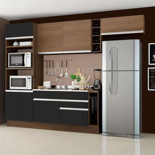 - Itens inclusos: 1 torre quente com dois nichos para forno e micro-ondas | 1 nicho menor e três portas sendo uma basculante | 1 balcão de pia com duas gavetas e uma porta, não acompanha tampo | 1 balcão porta panos com tampo Mood | 1 armário aéreo com duas portas com detalhe em vidro reflex | 1 mini adega | 1 armário aéreo com uma porta basculante