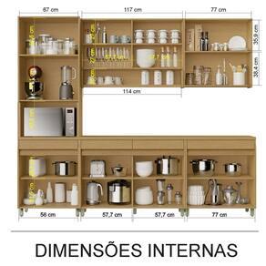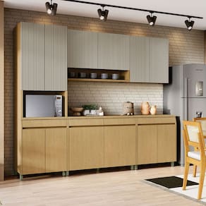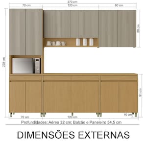 Portas robustas: MDF de 18 mm nos aéreos e 15 mm nos balcões, com caixas em MDF 15 mm e fundos em Duratree 3 mm anti-mofo, oferecendo maior resistência e proteção.