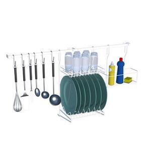 CONTEÚDO DA EMBALAGEM: - 02 Barras de fixação de 45 cm - 01 Escorredor suspenso - 06 Ganchos organizadores - 01 Cesto organizador suspenso - 01 Kit de buchas e parafusos para fixação em alvenaria