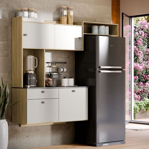 A Cozinha Suspensa com Nicho e Gaveta foi desenvolvida para oferecer mais organização e praticidade em cozinhas pequenas, integrando design moderno com excelente aproveitamento vertical. Com 151 cm de largura, conta com nicho para micro-ondas, porta basculante, prateleiras internas e gaveta espaçosa, mantendo tudo ao alcance das mãos. Produzida em MDP de alta qualidade, possui estrutura resistente, acabamento elegante e ótima capacidade de armazenamento para utensílios, mantimentos e eletroportáteis. Seu design suspenso facilita a limpeza do chão, garante leveza visual e se adapta perfeitamente a diferentes estilos de cozinha. Uma solução completa para quem busca funcionalidade, beleza e otimização de espaço