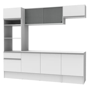 - 1 torre com nichos para forno e micro-ondas, com 1 gaveta e 2 portas, sendo 1 basculante com 1 balcão de pia agregado de 120 cm com 2 portas