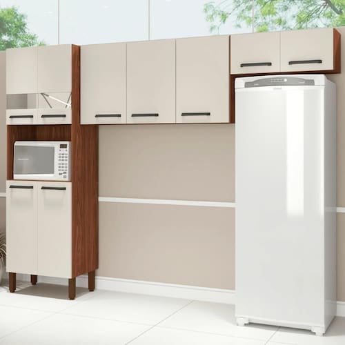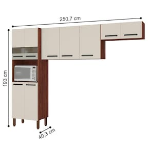 A Cozinha traz a praticidade e funcionalidade que você precisa, suas portas superiores se tornam o diferencial do produto pelo vidro espelhado, trazendo o destaque para a cozinha. Suas repartições bem elaboradas podem acomodar todas as suas necessidades para com uma cozinha, além de dispor de um nicho para micro ou forno elétrico. Sua matéria prima vem de madeiras de reflorestamento se tornando uma peça de design e responsabilidade com o meio ambiente.