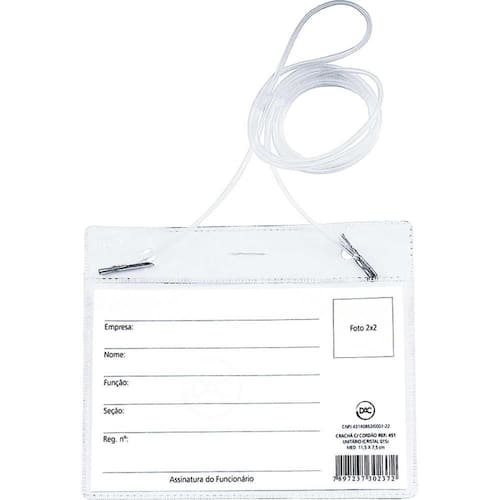 categoria: papelaria e escritorio nome: cracha com cordao descrição: pvc 11,5x7,5 cm. 0,15 marca: dac modelo: 451 ean: 7897237314511 embalagem: pacote com 50 dimensões da embalagem: - altura: 3 cm - largura: 14 cm - comprimento: 21 cm - peso: 0,41 kg Marca: Não Informado
