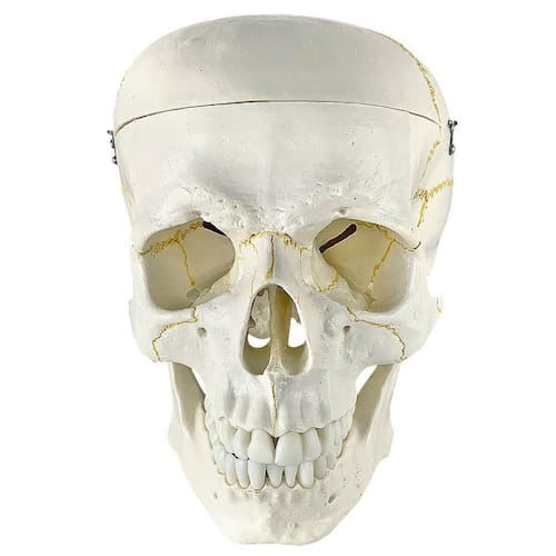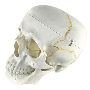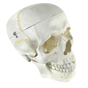 Modelo anatômico do crânio, em tamanho natural, desmontável em até 2 partes, evidencia estrutura interna, fissuras cranianas, base do crânio, arcada dentária e mandíbula articulável. Confeccionado em resina plástica rígida.