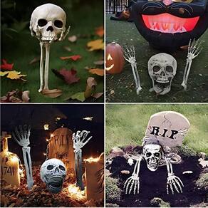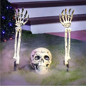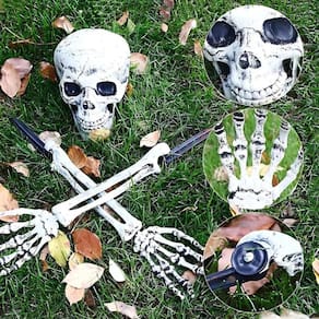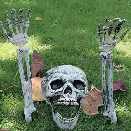 Crie uma atmosfera aterrorizante com o Crânio Esqueleto Halloween com 2 Braços para Fincar no Chão. Com um design extremamente realista, este conjunto inclui uma caveira e dois braços de esqueleto que simulam uma criatura emergindo do solo.