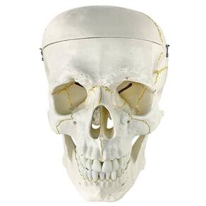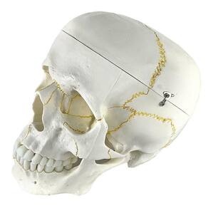 Modelo anatômico do crânio, em tamanho natural, desmontável em até 5 partes, evidencia estrutura interna, fissuras cranianas, base do crânio, arcada dentária e mandíbula articulável. Confeccionado em resina plástica rígida.