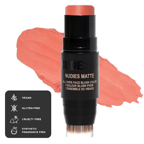 - O que é: o bastão de maquiagem Nudies Blush é um blush cremoso que realça sua beleza com um brilho jovem e saudável; vem em uma lata reciclável com bloco de cores em uma extremidade e pincel de mistura na outra, o que também o torna um ótimo tom de lábios e olhos para um visual monocromático completo.