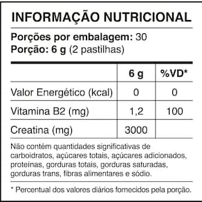 Creatina monohidratada, maltodextrina, aroma idêntico ao natural de laranja, carbonato de cálcio, acidulante ácido cítrico, estabilizante bicarbonato de sódio, agente de massa sorbitol, glaceante polietilenoglicol, antiumectante dióxido de silício, edulcorante glicosídeos de esteviol stévia e vitamina B12.