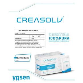 A Creasolv é uma creatina altamente solúvel por ser monohidratada e micronizada. É a escolha ideal para otimizar resultados. Além de sua tecnologia, Creasolv é muito prático com sachês individuais de 3 gramas. Cada display contém 30 sachês de 3 g de creatina, facilitando a adesão ao uso, garantindo máxima eficácia sem desperdícios. A creatina auxilia no aumento do desempenho físico durante exercícios repetidos de curta duração e alta intensidade.