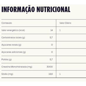 Ingredientes: creatina monohidratada, concentrado de cenoura e groselha negra, edulcorantes naturais xarope de maltitol e maltitol, estabilizante pectina, acidulante ácido citrico, aroma natural de frutas vermelhas. Não contem gluten. Contém aromatizante