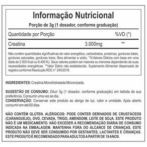 Ingredientes: Creatina Monohidratada Micronizada. Não contém glúten. Não contém lactose.