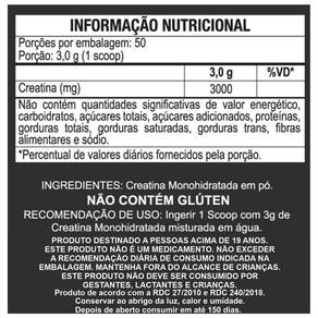 Creatina Monohidratada 150g Rende 50 Porções - Duom Supplements - dados e informações do produto - Marca - Duom Conteúdo líquido total - 150g. Rendimento total - 50 porções/doses. Sugestão de uso - Ingerir 1 Scoop com 3g de Creatina Monoidratada misturada em água. Informação Nutricional - Em anexo nas imagens. Composição/ingredientes - Em anexo nas imagens. Recomendações - Em anexo nas imagens. Peso líquido total - 150g. Peso aproximado produto + embalagem - 250g. Código de barras EAN - 7898665752388 Registro ANVISA - Produto dispensado de registro de acordo com a RDC 27/2010 e RDC 240/2018. Dimensões do produto - largura: 10 cm; altura: 10 cm; comprimento: 6 cm; circunferência: 31,5cm. Dimensões da embalagem/pacote - largura: 13 cm; altura: 10 cm; comprimento: 16 cm. Ean: 7898665752388