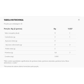 Ingredientes Creatina mono-hidratada, agentes de massa maltitol e sorbitol, gelificantes gelatina e pectinas, acidulante ácido cítrico, aromatizantes naturais, glaceante cera de carnaúba e corante clorofilas.