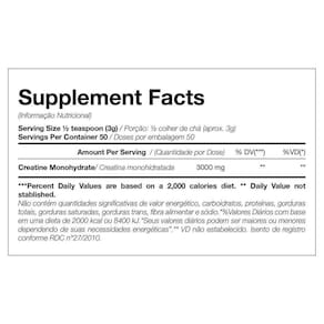 DescriçãoEste produto só tem um objetivo: explosão a principal função da creatina no organismo é o aumento da energia instantânea durante exercícios físicos de longa ou curta duração, principalmente em atividades de explosão.Como tomarMisture 1/2 colher de chá (3g) em 150ml de água, uma vez ao dia. IngredientesCreatina monohidratada.Não contém glúten.Não contém lactose.