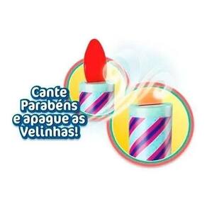 Conteúdo da caixa festa de aniversário: 1 toalha cartonada, 2 caixas cartonadas, 1 faca grande, 4 pedaços de bolo, 4 copos, 4 pratos, 4 garfos e 4 velinhas.