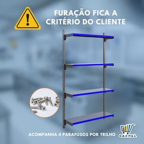 Cremalheira em aço para melhor custo benefício, acompanha bandejas com regulagem para melhor exposição dos produtos e porta etiquetas.