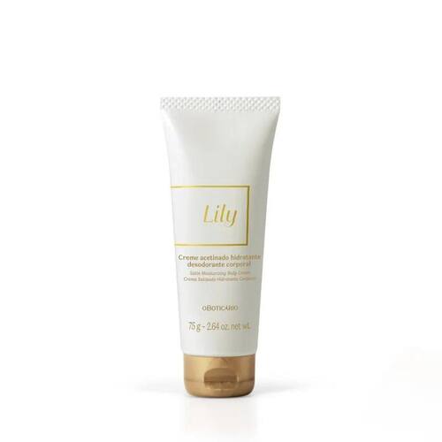 Creme Acetinado Hidratante Desodorante Corporal Lily 75g O Creme Acetinado Hidratante Desodorante Corporal Lily entrega sua fragrância preferida em um tamanho prático para levar em todas as ocasiões. O creme acetinado é a combinação ideal de perfumação intensa e prolongada com a sofisticada fragrância de Lily, que é da família olfativa Floral Bouquet. Sua textura aveludada e macia desliza facilmente na pele garantindo: Perfumação intensa e prolongada; Hidratação por até 48h; Textura macia e aveludada; Desliza suavemente pela sua pele. Composto por Karité que cria uma película protetora e Vitamina E, o creme corporal proporciona pele protegida E hidratação por até 48 horas, tem rápida absorção para uma sensação de pele sequinha. Marca: Não Informado