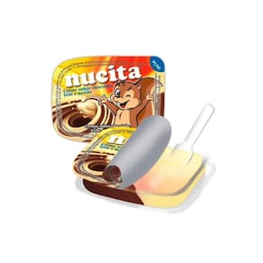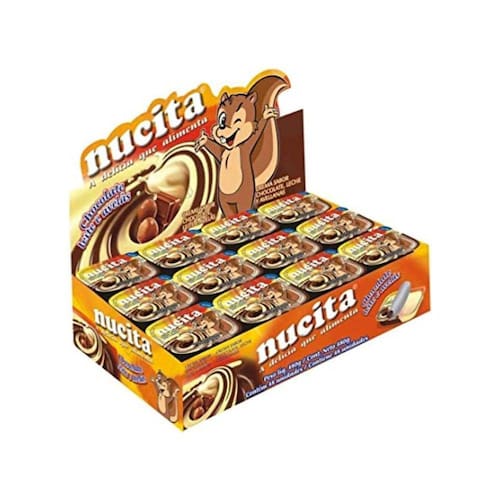 Caixa contendo 48 unidades de creme sabor chocolate sabor artificial de leite e avelãs Nucita Bicolor com 10 gramas cada. Peso líquido de 480 gramas.