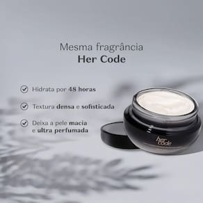 Além de hidratar, o Creme Her Code possui ação desodorante que ajuda a manter a pele fresca e perfumada, ideal para o uso diário e para quem busca sensação de limpeza e conforto prolongados.