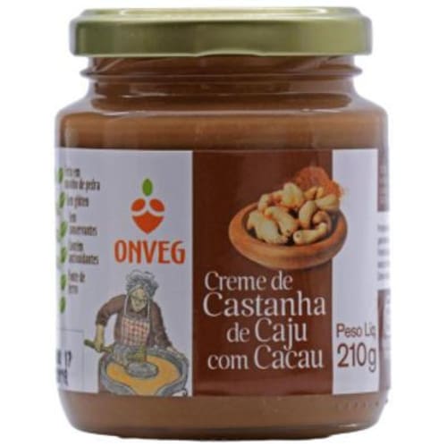 Creme Castanha De Caju Com Cacau Onveg 210G Rico em proteína, minerais e ômega 3 o creme de castanha de caju na versão cacau tem todos os benefícios antioxidantes e o sabor do cacau. Sem o uso de óleos refinados e teor de açúcar reduzido Produto artesanal feito lentamente em moinho de pedra em baixa temperatura, o que garante ao alimento sua integridade nutricional, além de uma textura lisa e cremosa. Fonte de gorduras do bem. Feito em moinho de pedra Vegano Sem Glúten Fonte de Ferro Contém Antioxidantes Sem Conservantes Ingredientes: Castanha de caju natural, cacau em pó orgânico, açúcar mascavo orgânico e essência natural de baunilha. Não contém Glúten Alérgicos: contém Castanha de Caju. Pode conter traços de amendoim. Peso 210g Marca: Ongev