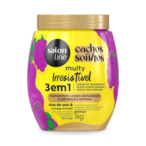 Contém: 01 - Creme Condicionador Uva Multy Irresistível, linha Cachos dos Sonhos, Salon Line, 1kg O Creme Condicionador 3 em 1 Uva Multy Irresistível da Salon Line é um produto multifuncional desenvolvido para proporcionar um tratamento reparador intenso, antiporosidade e definição duradoura, podendo ser como creme de tratamento, condicionador ou creme de pentear. Sua fórmula é enriquecida com extrato de uva, que é rico em antioxidantes, combatendo o ressecamento e hidratando profundamente os fios, e de karité que nutre profundamente, garantindo maciez e proteção contra o ressecamento. Com ação hidro-reparadora que repara os danos, fortalece e hidrata profundamente os fios, ele também modela os cachos sem pesar, garantindo leve e movimento aos fios. Características Principais: - 1kg; - 3 em 1; - Tratamento hidro-reparador e definição intensa; - Fórmula enriquecida com extrato de uva e de karité; - Definição duradoura; - Ação antiporosidade; - Antifrizz; - Fórmula vegana; - Ideal para cabelos cacheados e crespos. Marca: Não Informado