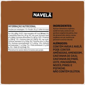 Ingredientes: Açúcar demerara orgânico, avelã torrada, aveia em pó, gordura vegetal de palma, óleo de girassol, cacau orgânico em pó, lecitina de girassol e aroma natural.