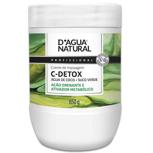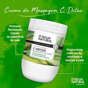 Desenvolvido com exclusivo blend de suco verde e água de coco desidratada, o creme C-DETOX Dagua Natural, possui ação drenante e desintoxicante, além de reforçar o sistema antioxidante da pele. A combinação dos extratos de abacaxi, couve, gengibre e pepino promovem a renovação celular na superfície da pele além de promover a ativação da circulação, devido à sua ação termogênica. A água de coco estimula a eficiência energética das células, atuando por mecanismo Detox mitocondrial proporcionando mais saúde, vitalidade e energia à pele. Deslizamento ideal para massagem. Altamente emoliente. Livre de parabenos.