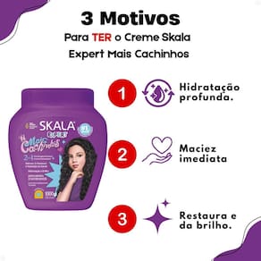 Creme De Tratamento Skala Expert Mais Cachinhos 1000g: Definição e Hidratação para Cachos Perfeitos O Creme de Tratamento Skala Expert Mais Cachinhos 1000g é a solução ideal para quem busca cuidar intensamente dos cabelos cacheados, crespos, crespíssimos ou em transição. Com uma fórmula enriquecida e potente, este creme proporciona uma hidratação profunda e duradoura, transformando seus cachos em fios definidos, macios e com um brilho espetacular.