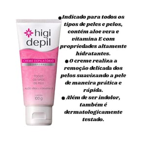 Creme Depilatório Para Corpo Aloe Vera E Vitamina E Higi Depil Indicado para todos os tipos de peles e pelos, contém aloe vera e vitamina E com propriedades altamente hidratantes. O creme realiza a remoção delicada dos pelos suavizando a pele de maneira prática e rápida. Além de ser indolor, também é dermatologicamente testado. Chega de sofrer com pinças, cera quente ou lâminas O Creme Facial Depilatório Higi Depil é a solução ideal para remover os pelos indesejados do rosto de forma rápida, eficaz e indolor. Sua fórmula suave, desenvolvida especificamente para a pele delicada do rosto, garante uma pele macia e lisa em poucos minutos, sem agredir ou irritar. Eficácia e Suavidade em um Único Produto: Fórmula Suave: Especialmente formulado para a pele sensível do rosto buço, queixo, costeletas , o creme Higi Depil age de forma delicada, minimizando o risco de vermelhidão e irritação. Depilação Indolor e Rápida: Esqueça a dor da cera e o risco de cortes da lâmina. A aplicação é simples e o produto age em poucos minutos, dissolvendo os pelos da superfície da pele. Pele Macia e Hidratada: Sua composição inclui agentes que hidratam e cuidam da pele durante o processo, deixando-a com uma sensação de maciez e sedosidade após a remoção. Resultado Duradouro: A remoção dos pelos é feita na altura da pele, proporcionando uma pele lisa por mais tempo do que a depilação com lâmina. Praticidade para o Dia a Dia: A embalagem prática e o modo de uso descomplicado permitem que você faça a depilação no conforto da sua casa, economizando tempo e dinheiro. INSTRUÇÕES DE USO: Faça o teste de sensibilidade antes de utilizar o produto. Aplique uma pequena quantidade do creme depilatório facial na dobra do braço e deixe agir por 10 minutos. Não friccionar. Remover o creme com uma esponja ou toalha umedecida em água morna. Aguardar 24 horas. Se a pela não ficar vermelha ou irritada, prosseguir com o uso do produto. Precauções Importantes: Teste de Sensibilidade: Faça um teste de sensibilidade antes de usar o produto em toda a área. Uso Externo: Produto para uso externo. Evite Contato com os Olhos: Em caso de contato acidental, enxágue com água abundante e procure um médico. Restrições: Não utilize em pele irritada, lesionada ou com feridas. Com o Creme Facial Depilatório Higi Depil, você tem a de uma pele lisa, bem cuidada e livre de pelos, com toda a segurança e praticidade que o seu rosto merece.