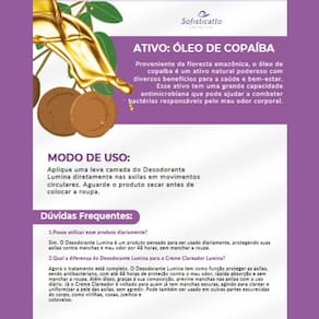Creme Desodorante Antimancha Escura Na Axila 48h De Proteção Desodorante Antimanchas Proteção e Cuidado para Sua Pele Você está cansado de manchas nas axilas causadas pelo desodorante Experimente agora o Desodorante em Creme Antimanchas Lumina, desenvolvido para proteger sua pele e suas roupas O Desodorante Antimanchas Antitranspirante Lumina que proporciona proteção por até 48 horas, atua como um tratamento para evitar manchas nas axilas. Lumina Desodorante é formulado com Óleo de Copaíba proveniente da floresta amazônica que é um ativo natural poderoso com diversos benefícios para a saúde e bem-estar. Esse ativo tem uma grande capacidade antimicrobiana que pode ajudar contra as bactérias responsáveis pelo mau odor corporal. Oferecendo uma proteção eficaz sem comprometer suas roupas favoritas. O Desodorante Antitranspirante Lumina redefine a experiência de cuidados pessoais, oferecendo uma solução completa para o seu dia a dia. DERMATOLOGICAMENTE TESTADO Benefícios do Desodorante Antimanchas: Antitranspirante Proteção 48 horas Contra manchas nas axilas Combate manchas em roupas Rápida absorção Fórmula testada dermatologicamente ATENÇÃO O Desodorante Lumina ajuda a evitar manchas nas axilas e NÂO possui ação clareadora. Caso você já tenha manchas nas axilas, precisa utilizá-lo em conjunto com o Clareador Corporal com Rosa Mosqueta Lumina ou algum de sua preferência. ANVISA PROCESSO: 25351.227969/2024-52 Modo de usar: Aplique uma leve camada do Desodorante Lumina diretamente nas axilas em movimentos circulares. Aguarde o produto secar antes de colocar a roupa. Dúvidas Frequentes: 1.Posso utilizar esse produto diariamente Sim. O Desodorante Lumina é um produto pensado para ser diariamente, protegendo suas axilas contra manchas e mau odor por 48 horas, sem manchar a roupa. 2.Qual a diferença do Desodorante Lumina para o Creme Clareador Lumina Agora o tratamento está completo. O Desodorante Lumina tem como função proteger as axilas, sendo antibacteriano, com até 48 horas de proteção contra o mau odor, rápida absorção e sem manchar a roupa. Além disso, graças à sua composição, previne manchas nas axilas com o uso diário. Já o Creme Clareador é voltado para quem já tem manchas escuras, agindo para clarear e uniformizar a pele das axilas, sem agredir. Pode também ser em outras partes escurecidas do corpo, como virilhas, coxas, joelhos e cotovelos -------------------------------------- Tags de Pesquisa: Desodorante antimanchas, manchas nas axilas, proteção contra manchas, desodorante que não mancha roupas, evitar manchas nas roupas, melhor desodorante anti manchas, desodorante para desmanchar axilas, axila escura, axilas escuras o que fazer, axila escura o que pode ser, mancha escura axila