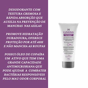 Creme Desodorante Antimancha Roupas E Axilas 48h De Proteção Desodorante Antimanchas Proteção e Cuidado para Sua Pele Você está cansado de manchas nas axilas causadas pelo desodorante Experimente agora o Desodorante em Creme Antimanchas Lumina, desenvolvido para proteger sua pele e suas roupas O Desodorante Antimanchas Antitranspirante Lumina que proporciona proteção por até 48 horas, atua como um tratamento para evitar manchas nas axilas. Lumina Desodorante é formulado com Óleo de Copaíba proveniente da floresta amazônica que é um ativo natural poderoso com diversos benefícios para a saúde e bem-estar. Esse ativo tem uma grande capacidade antimicrobiana que pode ajudar contra as bactérias responsáveis pelo mau odor corporal. Oferecendo uma proteção eficaz sem comprometer suas roupas favoritas. O Desodorante Antitranspirante Lumina redefine a experiência de cuidados pessoais, oferecendo uma solução completa para o seu dia a dia. DERMATOLOGICAMENTE TESTADO Benefícios do Desodorante Antimanchas: Antitranspirante Proteção 48 horas Contra manchas nas axilas Combate manchas em roupas Rápida absorção Fórmula testada dermatologicamente ATENÇÃO O Desodorante Lumina ajuda a evitar manchas nas axilas e NÂO possui ação clareadora. Caso você já tenha manchas nas axilas, precisa utilizá-lo em conjunto com o Clareador Corporal com Rosa Mosqueta Lumina ou algum de sua preferência. ANVISA PROCESSO: 25351.227969/2024-52 Modo de usar: Aplique uma leve camada do Desodorante Lumina diretamente nas axilas em movimentos circulares. Aguarde o produto secar antes de colocar a roupa. Dúvidas Frequentes: 1.Posso utilizar esse produto diariamente Sim. O Desodorante Lumina é um produto pensado para ser diariamente, protegendo suas axilas contra manchas e mau odor por 48 horas, sem manchar a roupa. 2.Qual a diferença do Desodorante Lumina para o Creme Clareador Lumina Agora o tratamento está completo. O Desodorante Lumina tem como função proteger as axilas, sendo antibacteriano, com até 48 horas de proteção contra o mau odor, rápida absorção e sem manchar a roupa. Além disso, graças à sua composição, previne manchas nas axilas com o uso diário. Já o Creme Clareador é voltado para quem já tem manchas escuras, agindo para clarear e uniformizar a pele das axilas, sem agredir. Pode também ser em outras partes escurecidas do corpo, como virilhas, coxas, joelhos e cotovelos -------------------------------------- Tags de Pesquisa: Desodorante antimanchas, manchas nas axilas, proteção contra manchas, desodorante que não mancha roupas, evitar manchas nas roupas, melhor desodorante anti manchas, desodorante para desmanchar axilas, axila escura, axilas escuras o que fazer, axila escura o que pode ser, mancha escura axila