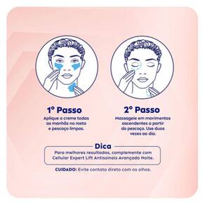 Aplique o creme todas as manhãs no rosto e pescoço limpos. Evite o contato direto com os olhos. Massageie em movimentos ascendentes a partir do pescoço. Use duas vezes ao dia. Para melhores resultados, complemente com Cellular Expert Lift Antissinais Avançado Noite.