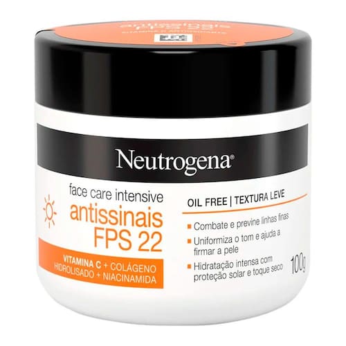 O Creme Facial Neutrogena Intensive Antissinais FPS22 traz na sua fórmula 3 ingredientes dermatologicamente comprovados em um só produto: vitamina C antioxidante, colágeno, niacinamida. Hidrata profundamente a pele recuperando a firmeza e elasticidade, suaviza rugas e marcas de expressão, clareia manchas, reduz a hiperpigmentação, auxilia na formação de colágeno, oferece hidratação e luminosidade. estimula a renovação celular, auxilia na uniformização do tom da pele e previne o envelhecimento.