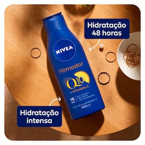 O Creme Hidratante Corporal Firmador Nivea Q10 Vitamina C 200ml foi desenvolvida especialmente para hidratar intensamente sua pele por até 48 horas, além de prevenir a flacidez. Sua fórmula é enriquecida com dois poderosos antioxidantes, Q10 e Vitamina C, que ajudam a combater os radicais livres, além de firmar visivelmente a pele e melhorar a sua elasticidade em 10 dias. Nivea Firmador Q10 Vitamina C possui uma textura cremosa que é absorvida facilmente, perfeito para peles extrasseca.