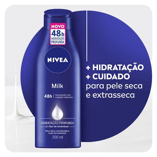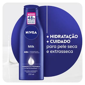 O Creme Hidratante Corporal Nívea Milk Pele Seca a Extrasseca proporciona 48 horas de cuidado intensivo e hidratação profunda graças a sua fórmula com 2x mais óleo de amêndoas. Foi especialmente desenvolvido para pele seca a extra-seca, promove uma agradável sensação de maciez na pele, cuidando e protegendo do ressecamento. Sua fórmula com textura densa é ideal para o uso diário, reduzindo a aspereza da pele seca.